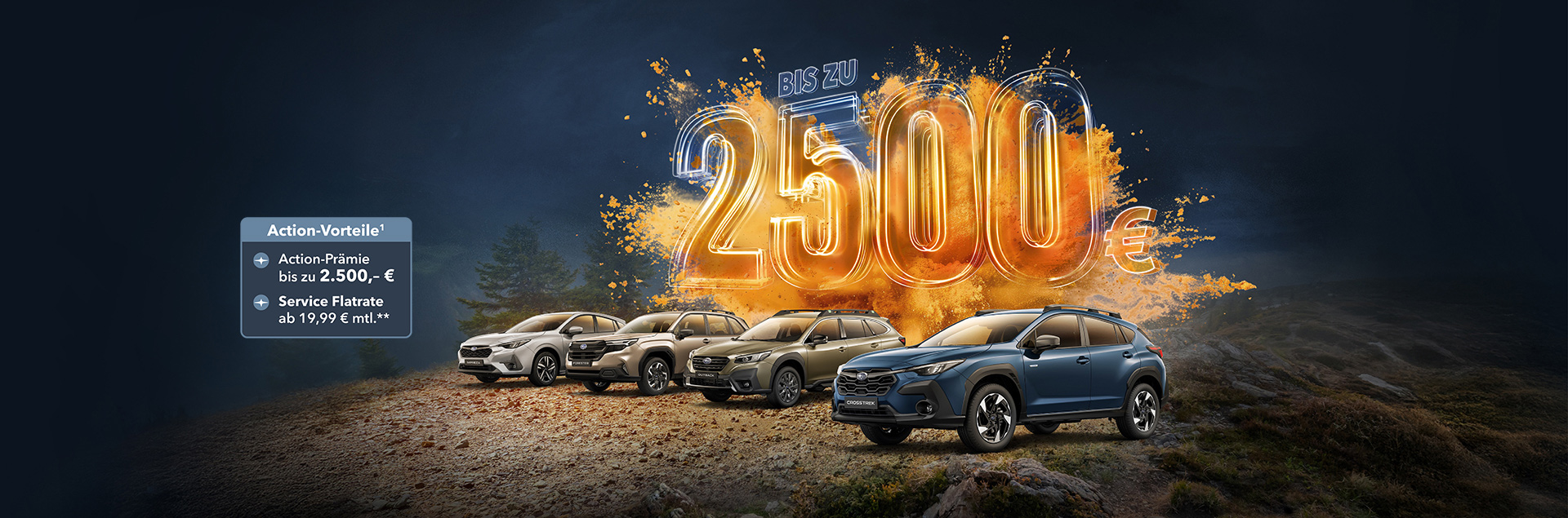 1 Die Aktion gilt vom 29.12.2025 bis 31.03.2026 in Verbindung mit dem Kauf eines aktuellen Subaru Impreza, Crosstrek, Outback oder Forester (Neu- oder Vorführwagen), Zulassung/Besitzumschreibung bis 30.06.2026 bei teilnehmenden Subaru Partnern. Die Aktion wird gemeinsam von der SUBARU Deutschland GmbH und den teilnehmenden Subaru-Partnern getragen und ist nicht mit anderen Aktionen der SUBARU Deutschland GmbH kombinierbar mit Ausnahme des Aktionsangebots zur Service-Flatrate. Sie sparen je nach Modell bei Kauf eines Subaru Crosstrek oder Impreza (MJ 2023/2024): 2.500,-€, eines Crosstrek oder Impreza (MJ 2025/2026): 1.200,-€, eines Outback (MJ 2024): 1.000,-€; eines Outback (MJ 2025): 2.000,-€, oder eines Forester (ab MJ 2025): 1.000,-€. Weitere Detailinformationen erhalten Sie bei Ihrem teilnehmenden Subaru Partner oder unter www.subaru.de.